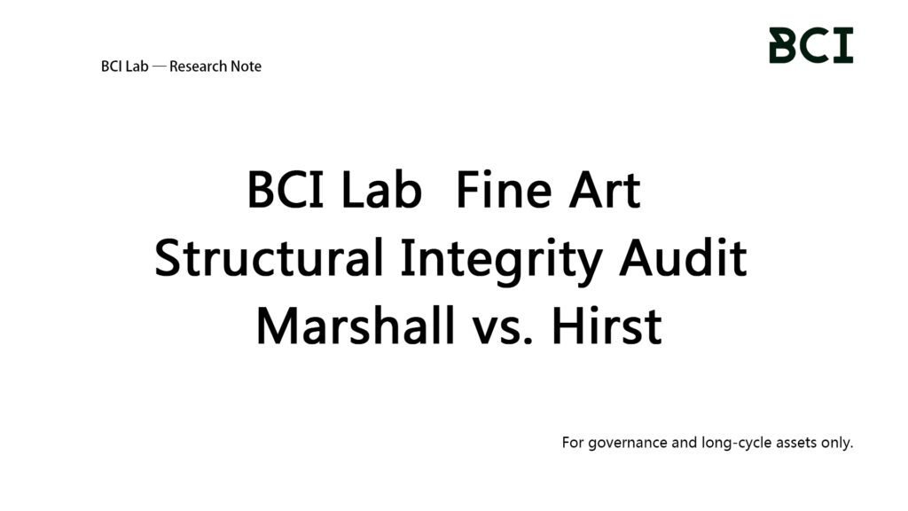 - Asset Beta (Hirst): Magnitude benchmarked against the 2008–2009 and 2022 liquidity contraction windows. Structural sensitivity deviation is comparatively elevated (Δ BCI = -0.18). Driven by peak Perceptual Legibility (PL), the asset exhibits derivative-like secondary market dynamics under liquidity stress. Under ES contraction, its premium structure exhibits heightened mean-reversion sensitivity under liquidity contraction.