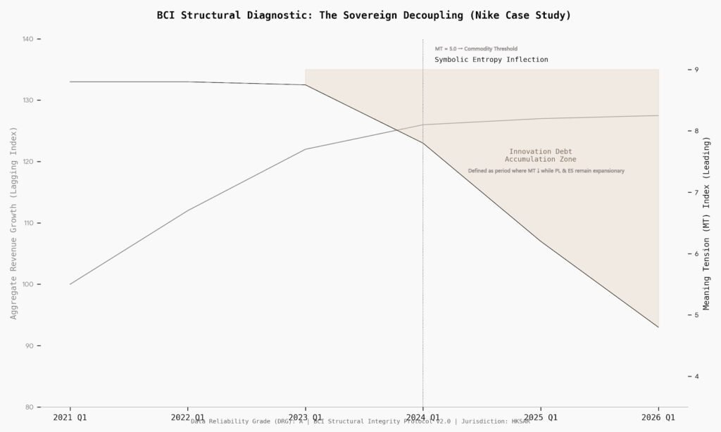 “The current multiple compression in Nike is not cyclical; it is the market’s delayed pricing of accumulated Innovation Debt and the structural decay of Meaning Tension.”